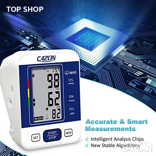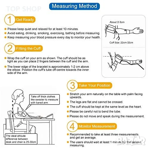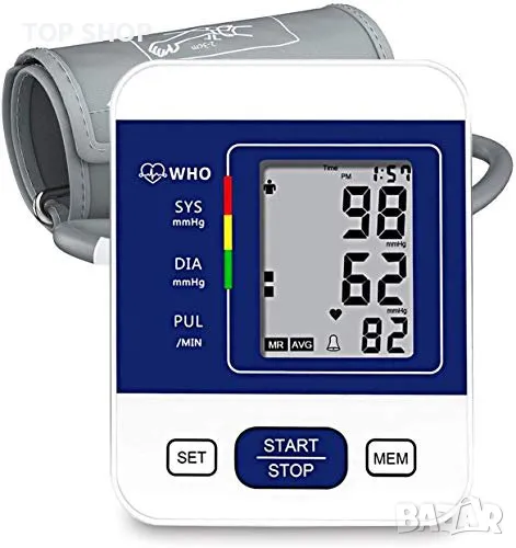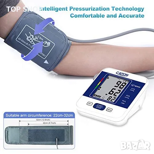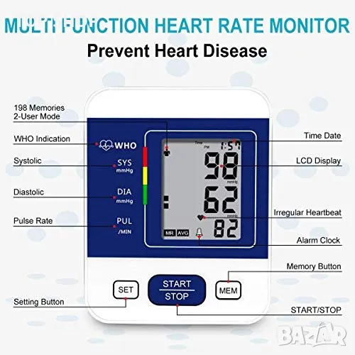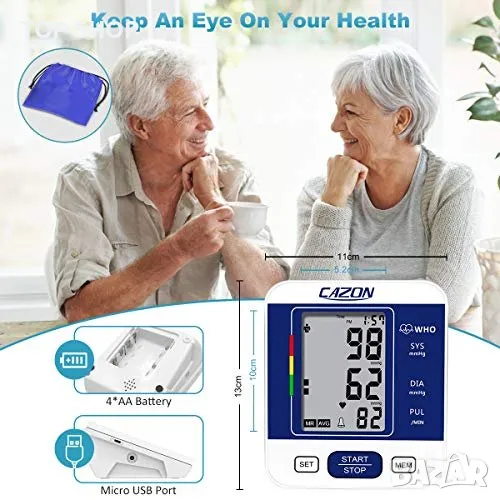 Относно този артикул Професионален и надежден монитор: този апарат за кръвно налягане на горната част на ръката с усъвършенствана технология за измерване ви дава изключително надеждни показания. Диапазоните на точност са: ±3 mmHg / ±0,4 kPa (кръвно налягане) и ±5% (пулсова честота). Препоръчва се от лекари за домашно наблюдение и записване на здравето и кръвното налягане. Двоен потребителски режим x 99 памет за съхранение: тази кръвна машина поддържа 2 потребители със собствени записи на измервания, всеки потребител може да запише до 99 показания. Показва средната стойност на последните ви 3 показания. Помага на потребителите лесно да проследяват своето здраве, кръвно налягане и сърдечен ритъм според конкретния час и дата. Регулируем удобен маншет и превключваем модул: с 22-32 см (8,7 инча – 12,6 инча) голям маншет, този апарат за кръвно налягане пасва на повечето хора в допустимия диапазон и има много здраво велкро велкро около маншета, за да го закрепи около ръката, супер лесно и удобен за домашна употреба. Мерните единици kPa и mmHg могат да се превключват по желание, подходящи за всеки навик за четене. Лесна работа: увийте маншета около горната част на ръката си, заемете правилна позиция на седене, вземете показанията си на LCD екрана с едно докосване на бутона. Показаните измервания включват: систолично налягане, диастолично налягане, честота на пулса, дата, час и потребителско име. Той ще се изключи сам без никаква операция за 30 секунди. Включен пакет: 1x апарат за кръвно налягане, 1x маншет за ръка, 1x USB кабел (без батерия и AC адаптер), 1x ръководство за употреба. Апаратът за кръвно налягане е чудесен избор за родители, баби и дядовци, любовници, приятели и може да се използва широко у дома или в кабинета на вашия лекар/медицинска сестра.