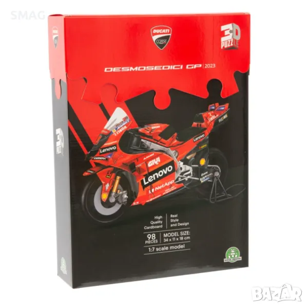 Нови пъзели Ducati от серията GP Sport: Върховно изживяване за любителите на скоростта и пъзелите! В колекцията GP Sport ще намерите вълнуваща поредица от 3D пъзели, които ще развълнуват любителите на мотоциклети и креативността! Открийте характерните 3D пъзели на Ducati, които съчетават любовта към детайла с адреналина на моторните спортове. Създайте в 3D мотора Desmosedici GP, моделът, който спечели шампионата на Moto GP 2023! В опаковката ще намерите 98 парчета висококачествен картон със страхотни детайли, лесни за сглобяване, тъй като не са необходими инструменти или лепило. Крайният модел е в мащаб 1:7 и с размери 34х11х18см.