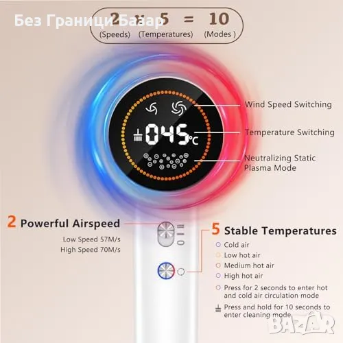 Скорост и ефективност: Изключително мощен мотор с 110,000 оборота за минута и силен въздушен поток за светкавично сушене.