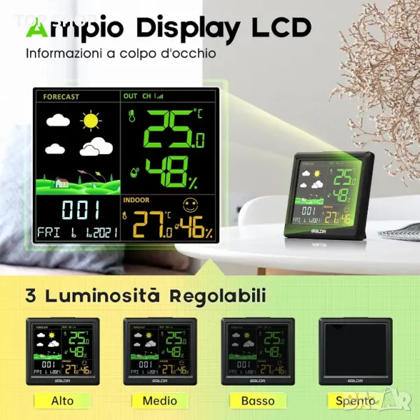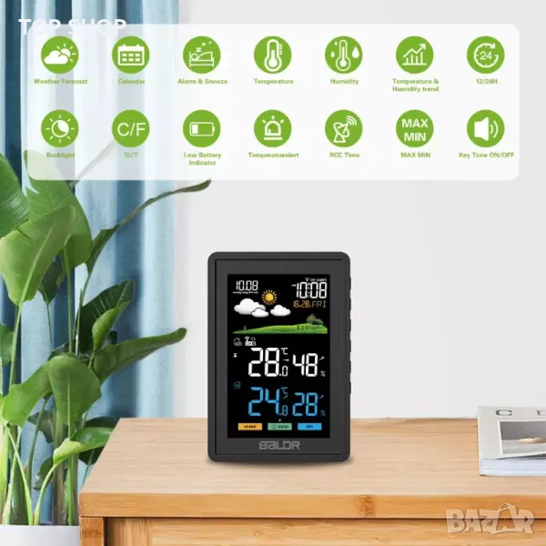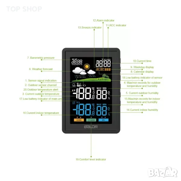 Комфортна икона, радиоуправляем, аларма Clcok, предупреждения за температура, тенденция на температура и влажност, календар, часовник, цветен екран, персонализирани предупреждения, цифров дисплей, външен сензор, вътрешна и външна температура, LCD дисплей, прогноза за времето, безжичен