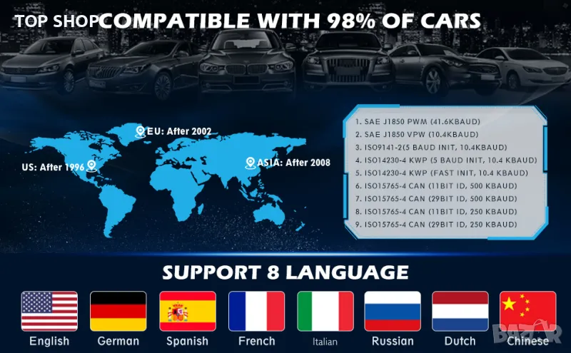 Съвместим с 98% от автомобилите: САЩ: след 1996 г.; ЕС: След 2002 г.; АЗИЯ: След 2008г