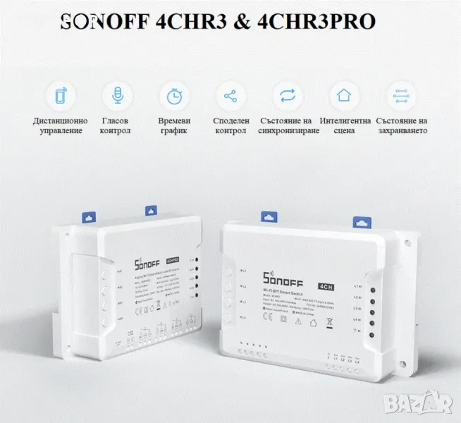 SONOFF 4CHR3 е 4-канален Wi-Fi интелигентен превключвател, предназначен да Ви даде възможността да интегрирате интелигентно управление във Вашия дом, за да създадете интелигентен дом. Всеки интелигентен превключвател има 4 групи, които могат да се използват за управление на осветлението и други домашни уреди едновременно в четири зони на Вашия дом. Има голяма разлика между 4CHR3 и 4CHPROR3, която е, че 4CHPROR3 е проектиран с допълнителна функция за RF контрол. Функцията е нарочно приета, за да Ви накара да включвате/изключвате устройството, свързано с 4CHPROR3 чрез дистанционното управление RM433. Новото подобрение на 4CHR3 и 4CHPROR3 в сравнение с 4CHPR2 и 4CHPROR2 е потребителите да задават тези 3 режима на работа в приложението “eWeLink” вместо в самия хардуер, по-лесно за работа. Така че можете да активирате режим на самозаключване, за да включите/изключите 4 свързани устройства поотделно, режим на блокиране, за да включите 1 свързано устройство всеки път и да изключите останалите устройства едновременно, и инчиращ режим, за да включите 1 свързано устройство и след това да го накарате да се включи изключва се автоматично след определено време (0,5 – 3600s). За устройството далеч от превключвателя можете да създадете подвижно пространство чрез DIN шина, за да ги свържете. Просто активирайте устройства чрез гласа си, когато превключвателят работи с Alexa и Google Home.