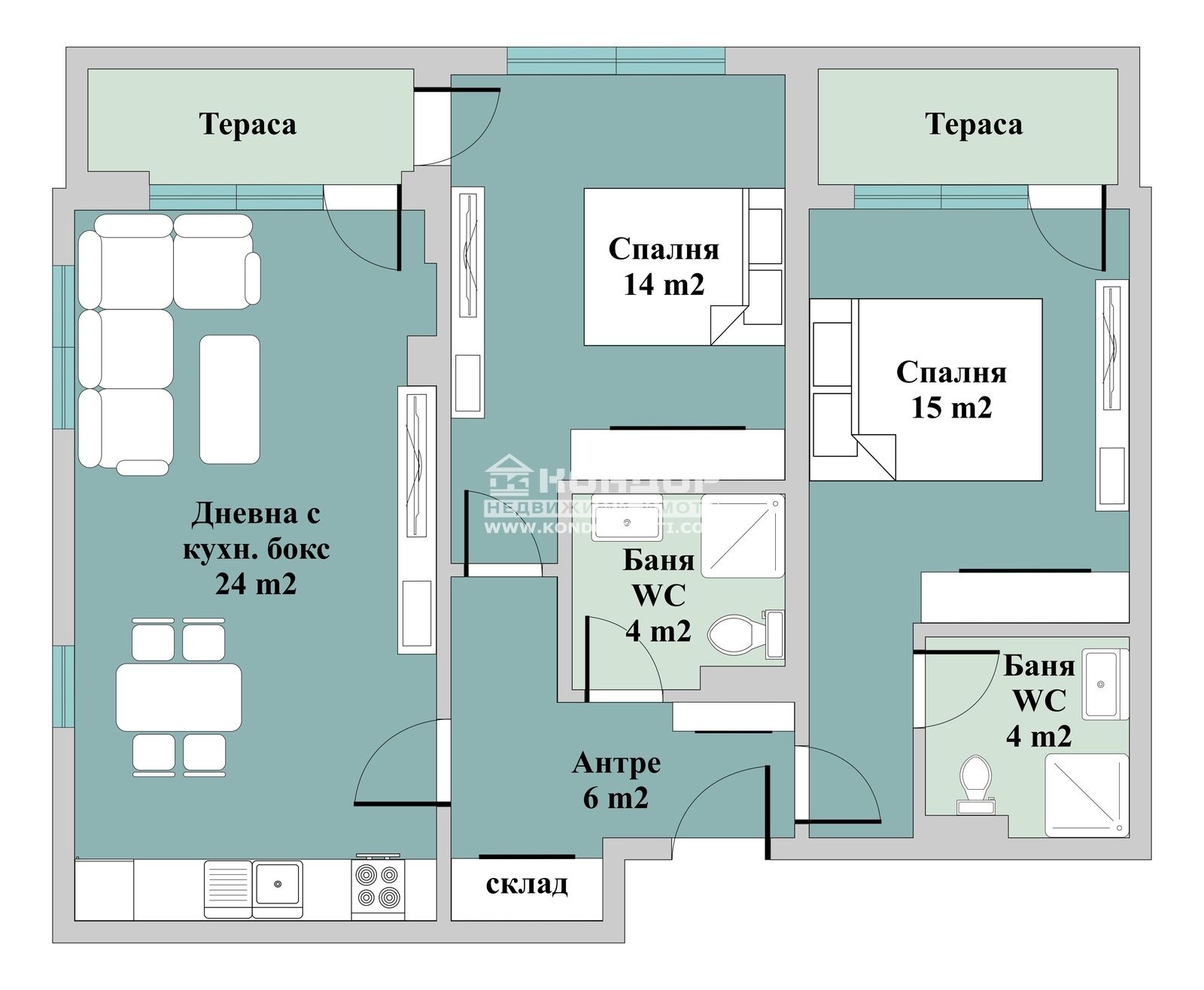 Тристаен апартамент, състоящ се от югоизточна дневна с трапезария и кухненски бокс - 24 м2, голяма родителска спалня - 15 м2 с прилежаща баня с тоалетна, детска стая -14 м2, второ санитарно помещение, входно антре с обособен кът за перално и две тераси.