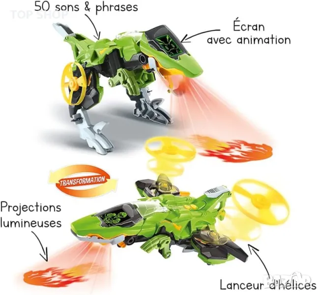 АНИМАЦИЯ: XXL двуцветна проекция се появява при натискане на пулсор: огнена топка в режим на динозавър и осветление в режим на самолет + цветен LCD дисплей с подсветка.