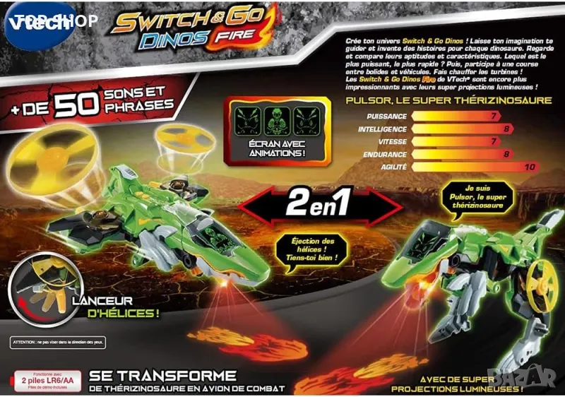 Pulsor, Super Thérizinosaure, Switch & Go Dinos е супертеризинозавър, който се превръща във военен самолет, препоръчва се за деца на 4 и повече години. Има XXL проекция в два цвята, която се появява при натискане на пулсора: огнена топка в режим на динозавър и мига в режим на самолет. Когато тази играчка динозавър е в режим на полет, натиснете два бутача, за да изпратите двете витла във въздуха. Pulsor, Super Thérizinosaurus разполага с LCD дисплей с подсветка, за да направи анимациите още по-реалистични. Клавишите издават фрази от света на динозаврите и реалистични звукови ефекти. С този динозавър и всички останали, детето може да създаде своята динозавърска вселена Switch & Go. Повече от 30 фрази и реалистични звукови ефекти са включени в тази играчка. Автоматичното изключване изисква 2 батерии LR6/AA (включени).
