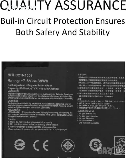 Батерия C21N1509, 7.6V, 38Wh притежава сертфикати CE, FCC и ROHS и отговаря на всички изисквания за безопасност, действащи на територията на държавите-членки на Европейски съюз.