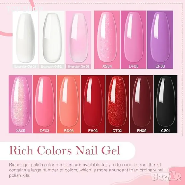 Комплект гел лак за нокти с горно и основно покритие: Основното покритие подобрява адхезията, горното покритие увеличава издръжливостта; Горното покритие може да бъде лъскаво или матирано. Твърдостта на основния гел е свързана главно с чистотата и грапавостта на нокътя при подготовката на маникюра. Уплътнителят обикновено има малко количество плаващо лепило, което трябва да се избърше с почистващ тампон. Когато се използва правилно, може да продължи до две седмици. Преди употреба е необходим кожен тест.