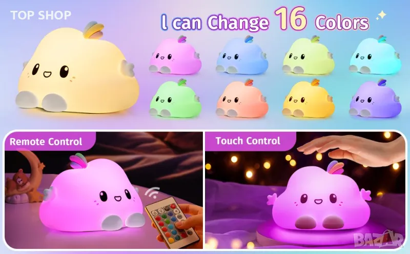 ☁️16 цвята и облачно осветление с дистанционно управление: Сладката облачна нощна лампа се предлага с 16 цвята и е верен приятел на възглавницата на вашето бебе! Led облачни светлини за детска стая имат 16 цвята, децата обичат цветовете на дъгата, които привличат и ги карат да се усмихват. Мекото облачно осветление на сладка нощна светлина за деца може да разсее тъмнината, да придружава децата, които се страхуват от тъмното, да спят тихо. Сладката нощна лампа е подходяща за майка за смяна на памперси/кърмене на бебе през нощта. Просто докоснете или дистанционно, за да го управлявате!