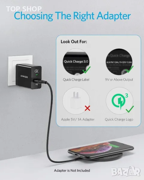 Стенен адаптер Quick Charge 2.0/3.0 (9V/2A) е необходим за режим на бързо зареждане.