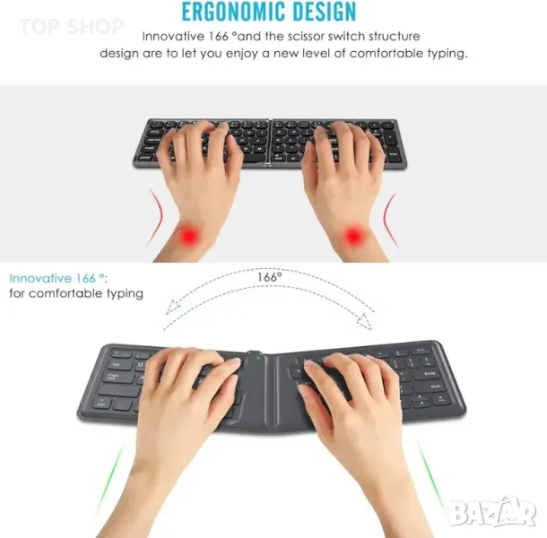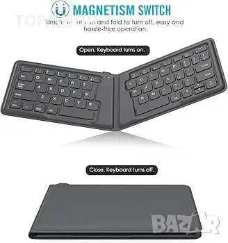 Сгъваема Bluetooth клавиатура: Тази преносима сгъваема клавиатура разполага с U-образна повърхност и 166-градусов ергономичен дизайн с вградени клавиши в пълен размер, които могат да ви осигурят страхотно и лесно за използване гладко и тактилно изживяване при писане, идеално за пътувания и командировки.