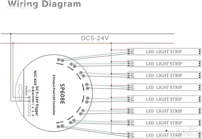 Изход с 8 порта: SK6812RGBW IC не може да се контролира. 8 изходни порта за сигнал работят независимо, светлинният ефект на всеки порт е независим, без единият да влияе на другия. Направете целия проект да изглежда по-готин и цветен. Изберете изходния порт, който искате да контролирате в приложението. Сложните проекти могат да бъдат изпълнени по-лесно. По-лесен за работа. Работете с всичките 8 изхода едновременно, всички светлинни ефекти ще бъдат синхронизирани. Напрежението зависи от LED лентата. DC5V LED лента, използвайте DC5V захранване.