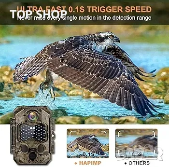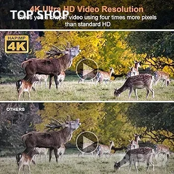 4K UHD видео и 32MP снимки: Камерата Hapimp PH810W изпраща изображения към мобилен телефон, използва най-новия сензор за изображения, за да записва резки 4K UHD видеоклипове и да заснема много детайлни 32MP изображения. Подобрена разделителна способност и наситеност на цветовете за подобрено потребителско изживяване. 2,4-инчовият LCD екран с висока разделителна способност позволява по-ясен изглед на дивата природа в записаните изображения