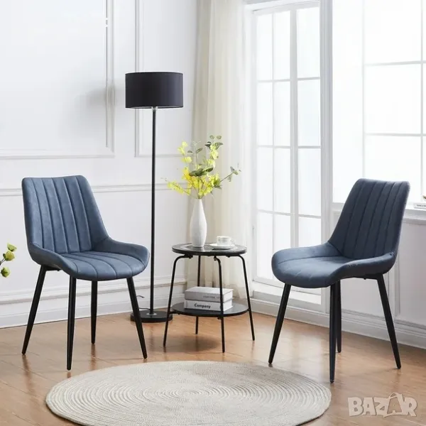 Дизайнът на столовете се отличава със съвременен силует с плътен гръб и елегантни заострени метални крака в контрастен цвят.