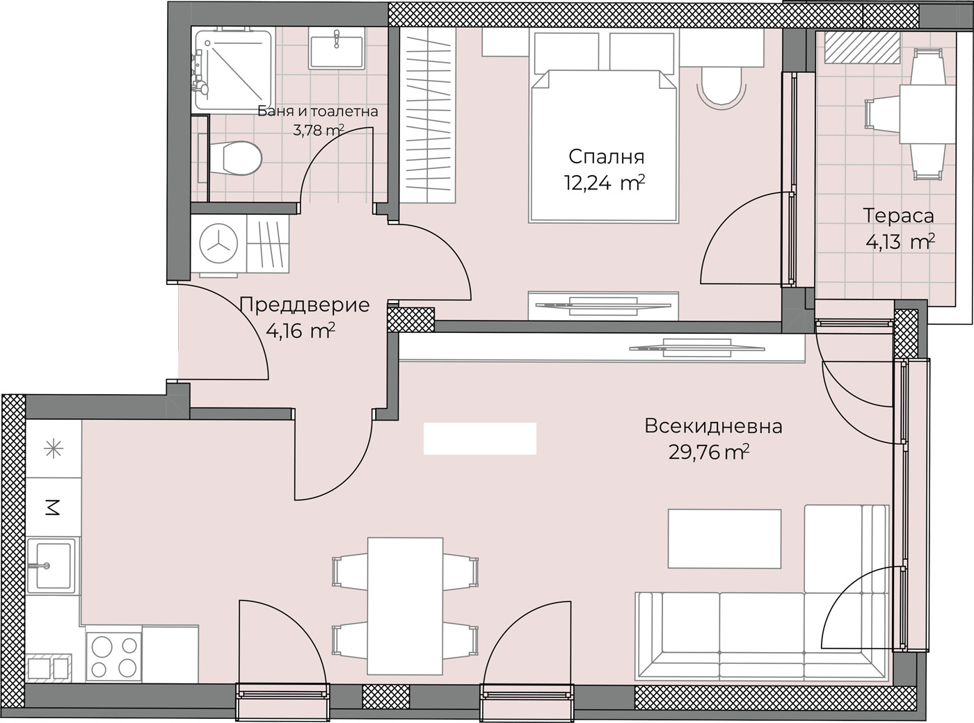 🔸 комфортна дневна с кухненски бокс с излаз на тераса;