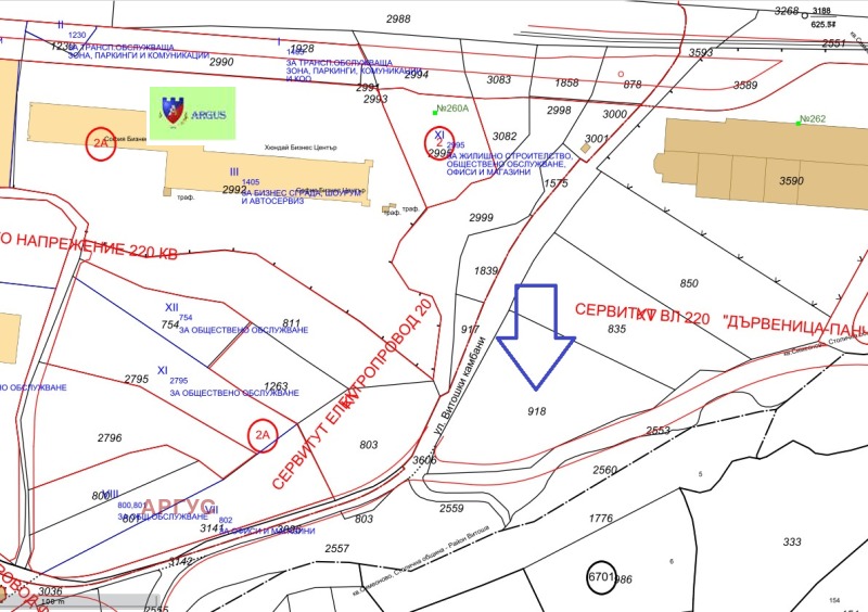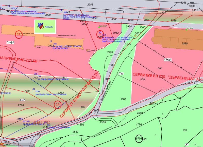Агенция 'АРГУС' продава поземлен имот на ВЪЗЛОВА локация. Намира се над 'HYUNDAI service' и 'ФРИЗОМАТ'. Бърз достъп до Околовръстен път по ул.'Витошки камбани'. Имотът има второ лице към улица в източна посока, която ще го свързва с кръговото за Младост 4. Имотът попада частично в смесена многофункционална зона Смф1 с устройствени показатели: 40% плътност на застрояване, Кинт 2.0 и в зона Тзв /терени за зелени транспортни връзки/. Парцелът е извън обсега на високото напрежение!