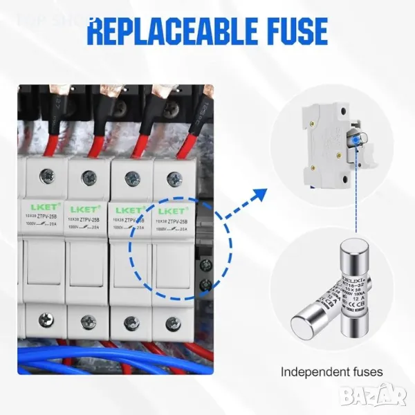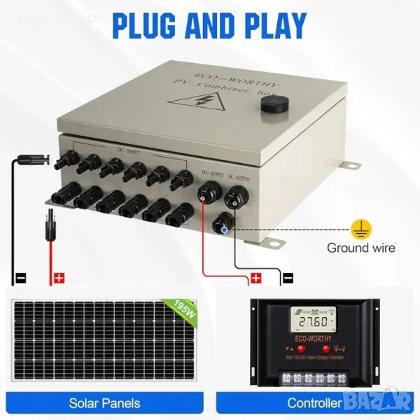 Конфигурация с 6 низа ]: тази комбинирана кутия се използва за свързване с няколко слънчеви панела. 10A номинален ток на предпазител за всеки низ.