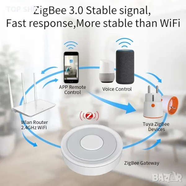 ZIGBEE Gate: ZigBee hub е необходимо устройство за всички ZigBee смарт устройства, което е по-стабилно и сигурно от използването на Wi-Fi система. Забележка: Smart Hub е съвместим само с интелигентни домашни устройства Tuya ZigBee и трябва да се свърже към 2,4 GHz WiFi честота (не 5 GHz).