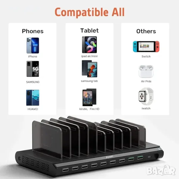 Alxum USB зарядна станция, 120 W 10 портова станция за бързо зареждане