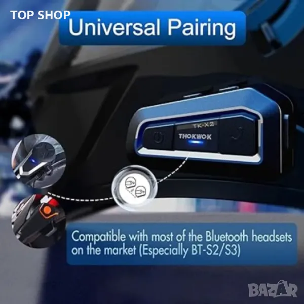интерком с разстояние от 800-1000 метра и до 3 ездачи, като само 2 ездачи могат да говорят едновременно, но трябва само да натиснете бутон, за да изберете двама ездачи да говорят. Универсална функция за сдвояване, може да се сдвоява не само с Bluetooth слушалки THOKWOK, като BT-S2, BT-S3, но и с повечето други Bluetooth слушалки на пазара.