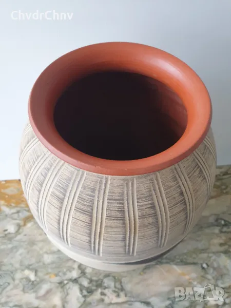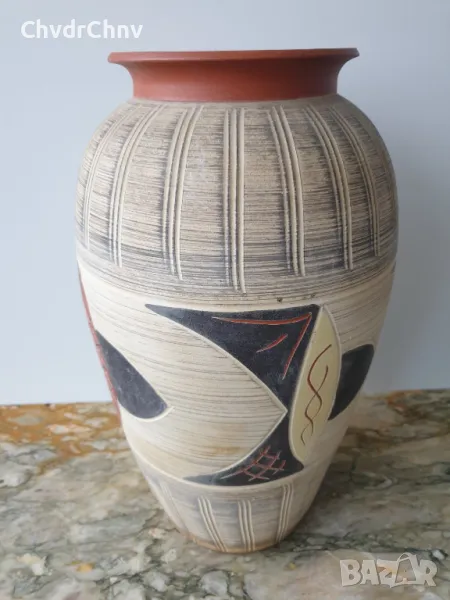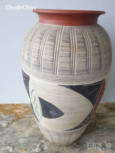 Височина 41 см, диаметър 24 см (макс), 16 см (отвор), 15 см (основа), ръчно рисувана (релеф) и оцветявана, плътна/тежка (около 4-5 кг), рядка, в перфектно състояние.