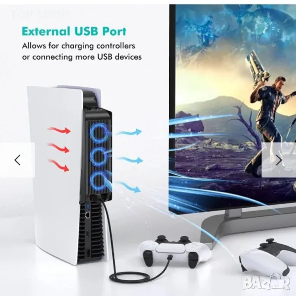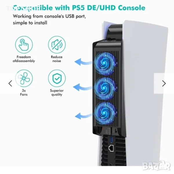 Вентилатор за охлаждане на PS5: Този модернизиран вентилатор за охлаждане на PS5 е проектиран да изтласква въздуха от конзолата и да предотвратява прегряване, с 3 подобрени турбо вентилатора, за да поддържа гладката и тиха работа на вашите игрови конзоли PS5 Digital Edition и PS5 Ultra HD.