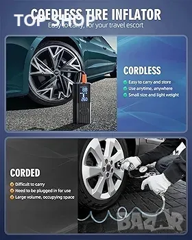 Двоен дисплей: Преносима въздушна помпа, вградена във високопроизводителен чип, може бързо да помпа гуми и да осигурява високоскоростен въздушен поток. Надува малки гуми за по-малко от 1 минута. Големият LED дисплей показва стойности на налягането в реално време и предварително зададени стойности, което улеснява наблюдението на състоянието на налягането в гумите. Конструкцията за автоматично изключване може също така да предотврати прекомерното надуване, което го прави безопасен за използване.