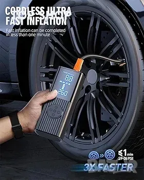 помпа за гуми се предлага с вградена акумулаторна батерия 20000 mA за захранване, което елиминира необходимостта от свързване към външен източник на захранване по време на употреба. Скоростта на надуване е три пъти по-бърза от другите обикновени безжични надувки на пазара, с 35% увеличение на мощността. Може да напомпа 12 автомобилни гуми или 30 гуми за състезателни велосипеди, далеч от проблема с ниската мощност