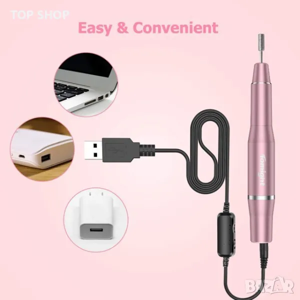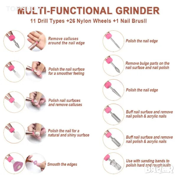 【Преносими и лесни за използване】11 вида свредла отговарят на вашите нужди за ноктопластика. Лесно е да смените свредлото без инструменти, просто го издърпайте и поставете. Лекият дизайн с форма на писалка го прави лесен за работа, чудесен за начинаещи или професионалисти. Компактният и преносим дизайн ви позволява да се наслаждавате на изкуството за нокти навсякъде, като си правите ноктите у дома или в салона за красота.