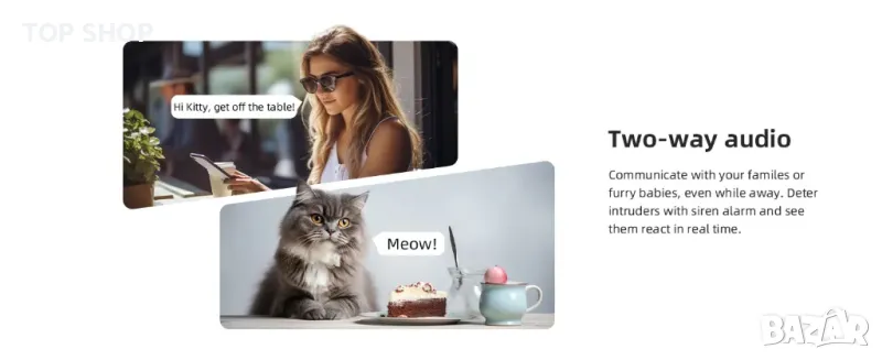 Двупосочно аудио и IR нощно виждане: Камерата за домашна охрана включва микрофонен високоговорител, оборудван с 3D намаляване на шума, създава перфектен двупосочен разговор, можете да общувате с вашето бебе/домашен любимец/бавачка/възрастен навсякъде и по всяко време. Шест IR светодиода и 22 фута Разстоянието за нощно виждане осигурява супер изживяване при нощно виждане в пълен мрак.
