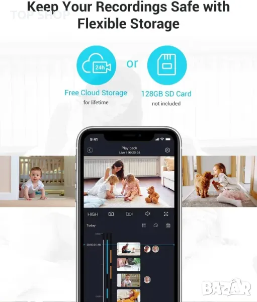 Допълнително облачно и локално съхранение: 24/7 CVR позволява на вътрешната камера за сигурност да поддържа непрекъснат запис в облака, избягвайки риска от загуба на видеозапис от карта с памет. Според часа, типа събития или името на камерата за бързо търсене на конкретното събитие. Поддържа до 128GB карта с памет. Гледане на живо на 4 охранителни камери едновременно в приложението blurams или официалния уеб портал.