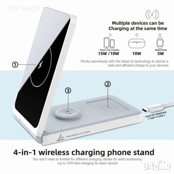 4 в 1 сгъваемо безжично зарядно устройство с огледало за гримиране, 15 W максимално бързо безжично зарядно устройство Qi, стойка за бързо зареждане, съвместима със смарт телефон за домашна баня, спалня Характеристики: