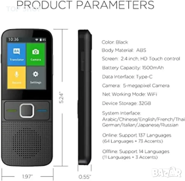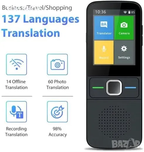 Устройство за езиков превод Двупосочно: Двупосочен превод в реално време Поддържа 137 езика, Превежда изговорения глас и го чете на глас, универсален превод лице в лице и превод на обаждания, по-точен и удобен от мобилното ПРИЛОЖЕНИЕ, Степента на точност достига 98%