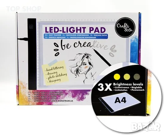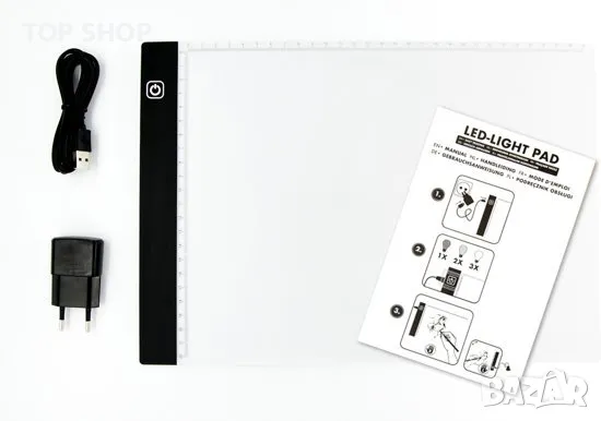 Например, имате ли скъпа хартия, на която не искате да правите грешки? След това първо направете скица на по-евтин лист. След това поставяте това листо върху лампата, поставяте скъпата хартия върху него и voila можете лесно да проследите скицата! Ще работите с акварел, но не искате скицата ви да се вижда през боята? След това направете скица, поставете я върху светлинната кутия, поставете нов лист хартия върху нея и ще видите, че скицата се вижда на новия ви лист. Сега можете лесно да прехвърлите с акварел това, което сте очертали по-рано. Искате ли да украсите тениска? Тогава вие работите същото. Първо скица, поставете я на леката подложка и сложете ризата си върху нея и покрийте! Имате ли силова банка? A4 Light Pad се предлага с адаптер и USB кабел, така че можете да започнете с него в движение.
