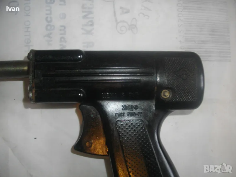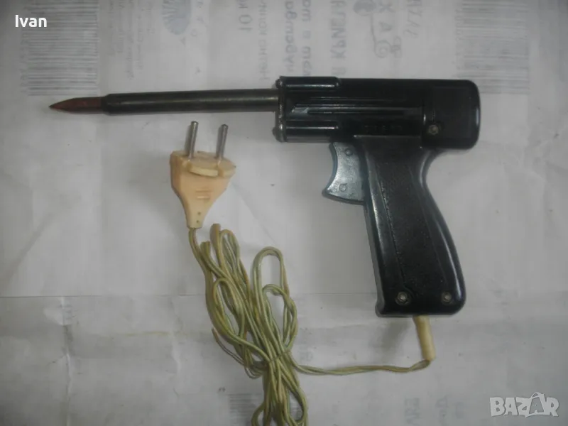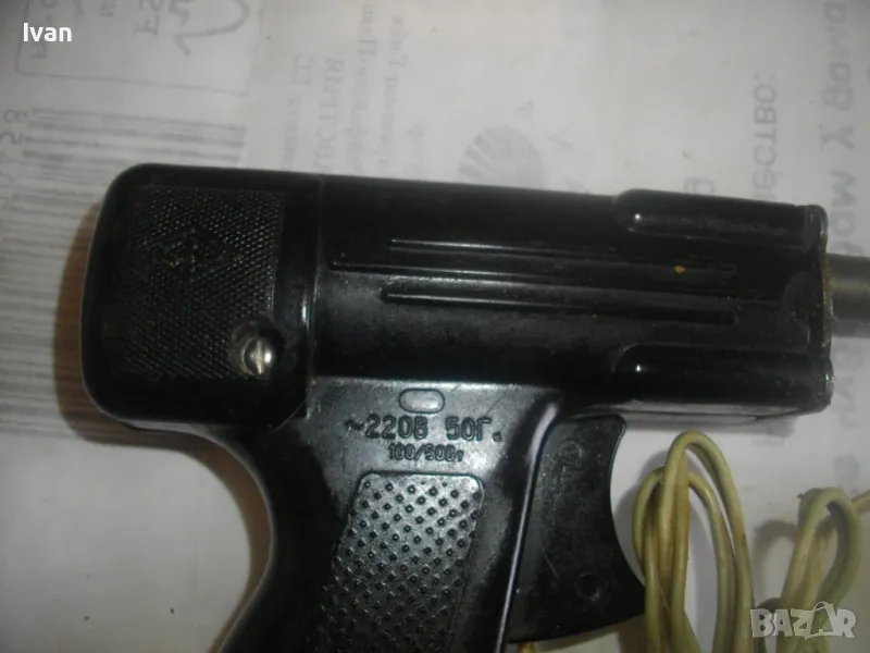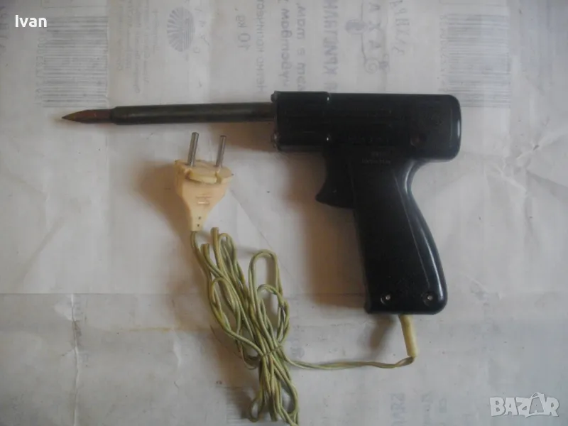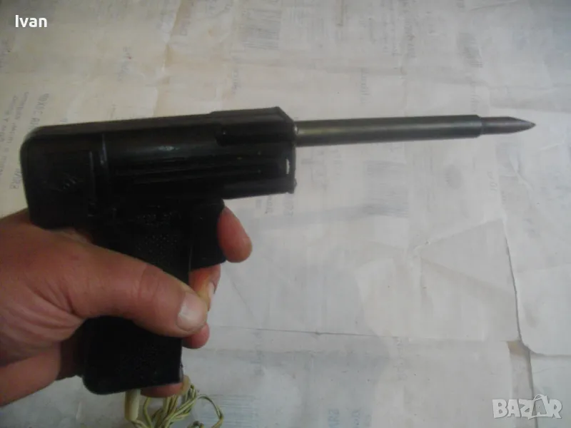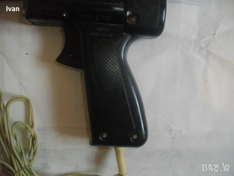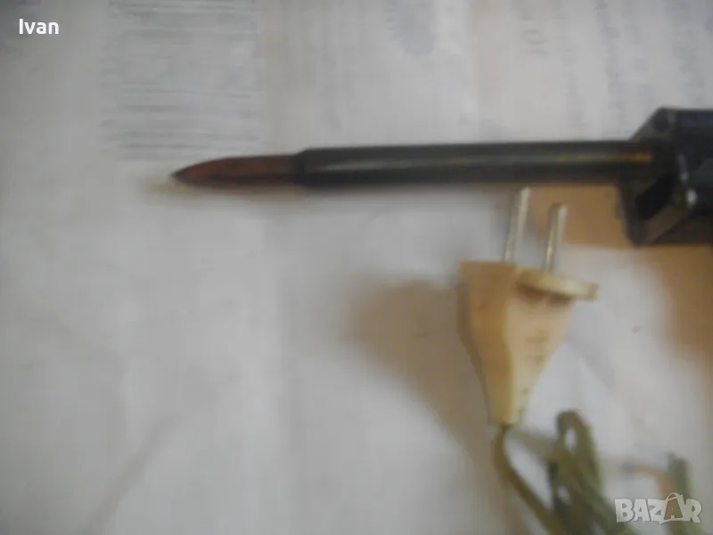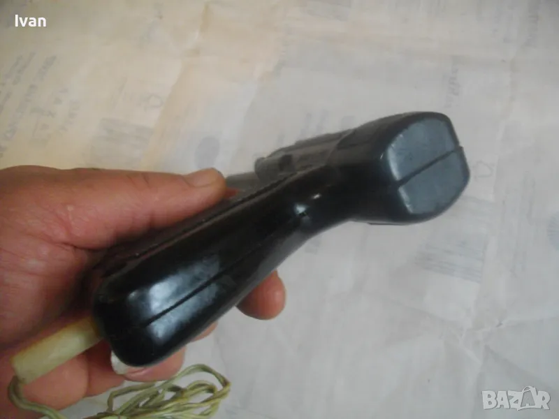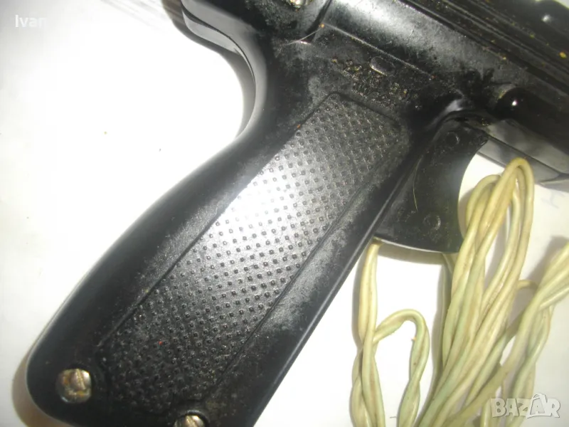 ОПИСАНИЕ на черен тънък руски/СССР поялник. Ретро, от втора половина на 70-те години на 20-ти век. Цена 159 лв. Много запазен външен вид и отлично техн./работно състояние. Маркировки: ЗПЦФ Гост 7219-77. Цена 6 рубли. 220 В/50 Г - 100/50 Вт. Реотанов. Дръжка и корпус - бакелит.Силна лампа вградена. Оригинален руски кабел с оригинален щепсел. Дължина отгоре 245 мм, дръжка дължина надолу - 150 мм. Цената 159 лв е твърда и крайна ни не подлежи на никакъв коментар.