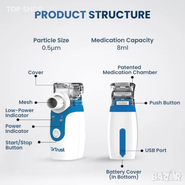 Кажете сбогом на обемистата, голяма и шумна машина за пулверизиране! Мрежестият пулверизатор Dr Trust е ултра лек (w98g) и джобен размер (72x40x113mm), за да го носите лесно за инхалиране навсякъде. Произвежда звук под 30db и е подходящ за домашна, клинична и детска употреба през нощта.