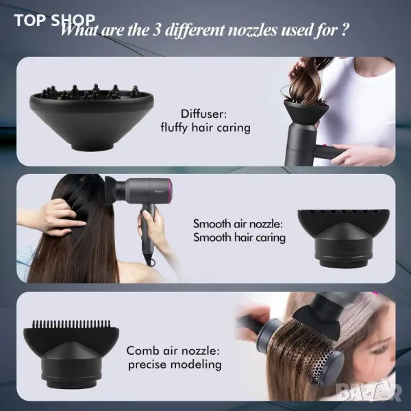 【Гъвкави приставки за концентратор и дифузер】 Сешоарът включва 2 приставки за концентратор и 1 дифузер, които се грижат за различни прически и позволяват гладко ежедневно оформяне или създаване на ясни къдрици. Забележка: За ваша безопасност не блокирайте задния изход за въздух и не поставяйте изхода за въздух с лицето надолу върху масата, когато сешоарът работи, моля, използвайте сешоара при 220V-240V.