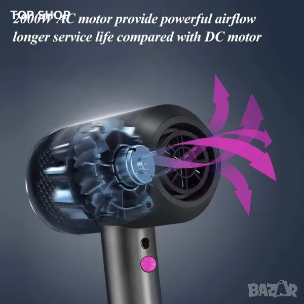 【Мощен променливотоков двигател с мощност 2000 W】 Този сешоар разполага с високоскоростен променливотоков двигател с мощност 2000 W за бързо, ефективно оформяне и бързо сушене, като осигурява мощен въздушен поток за оптимални резултати.