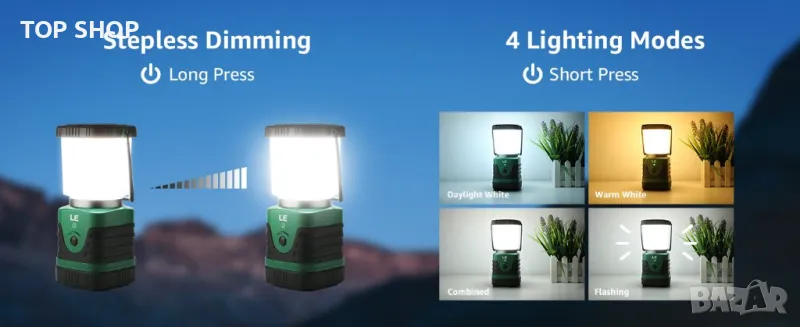 Акумулаторна и захранваща банка: Лампата за къмпинг може да служи и като захранваща банка за смартфон или мобилни устройства при спешни случаи. Поддържа USB кабел (включен) и 5V DC адаптер за зарядно устройство (не е включен), не е съвместим с адаптер над 5V напрежение.
