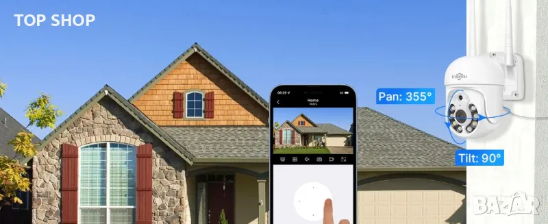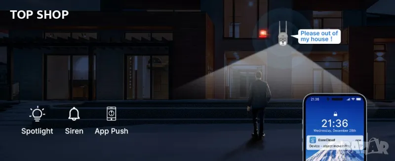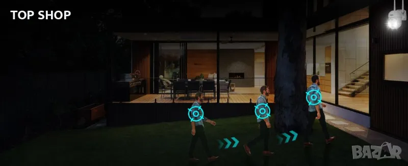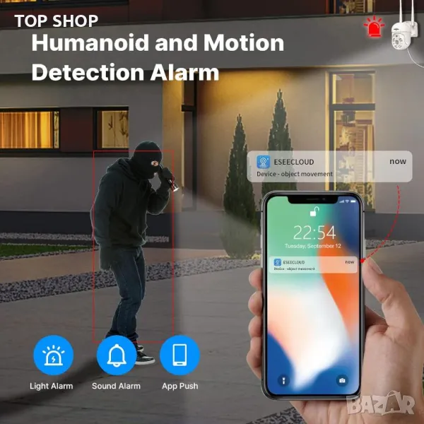 【Откриване на движение + Незабавно предупреждение за ПРИЛОЖЕНИЕ】Външните WiFi PTZ камери за сигурност притежават функцията за откриване на движение, тя ще изпрати алармено известие до телефона ви, когато движението бъде уловено, ще ви предупреди за възможен нарушител във вашия имот. Можете да настроите чувствителността на откриване на движение и зона или време на откриване, фокусирайте се върху специалната зона или време, за да намалите фалшивата аларма.