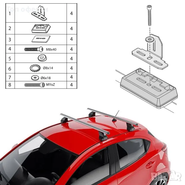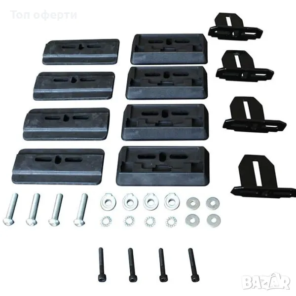 Комплектът съдържа 4 стоманени скоби за закрепване директно към покрива на автомобила в съответните фиксиращи точки.