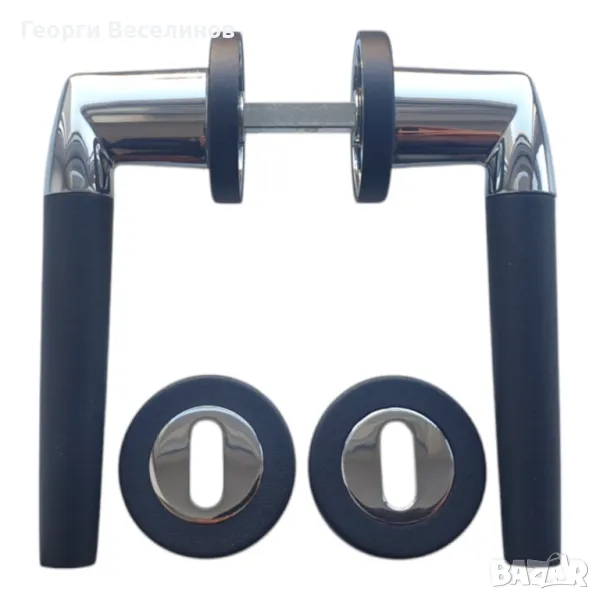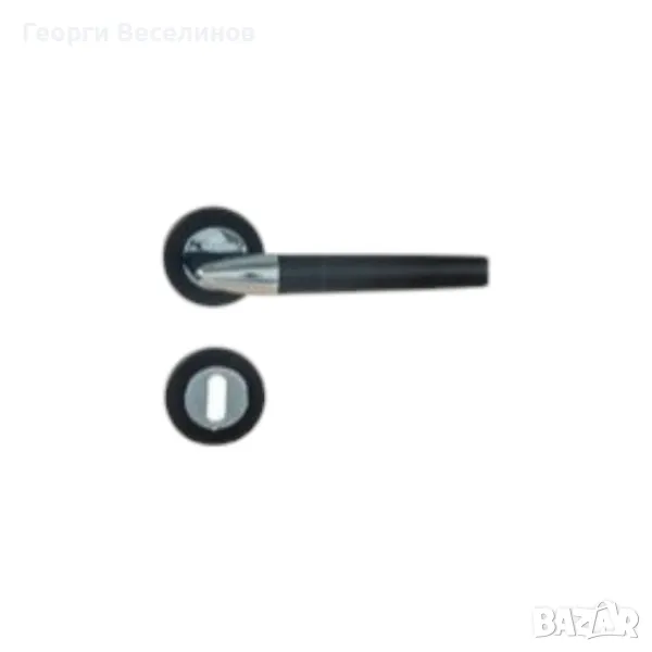 Дръжка за интериорна врата, Linea Bertomani, с черни дръжки и овални розетки с черни краища по външния диаметър. Изключително елегантна и стила, в същото време е видимо масивна. Много приятна при допир, за хващане. Идеална за модерен домашен интериор или официални офис помещения.