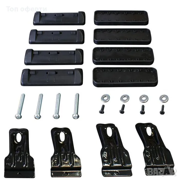 Комплектът съдържа 4 стоманени скоби с устойчиво на надраскване пластмасово покритие и гумени опорни подложки.