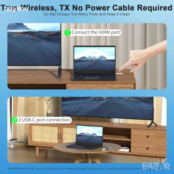 【Истински безжичен】 Предавателят не изисква захранващ кабел, ако HDMI портът или USB-C портът на лаптопа има функция за независимо захранване, той може да се използва нормално, без да поставяте захранващия кабел