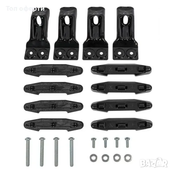 Комплектът съдържа 4 стоманени скоби с устойчиво на надраскване пластмасово покритие и гумени опорни подложки.