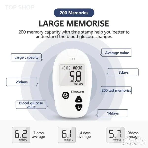 Глюкомер - Монитор за кръвна захар Sinocare Safe Accu с голям капацитет на паметта, производителност на висока цена