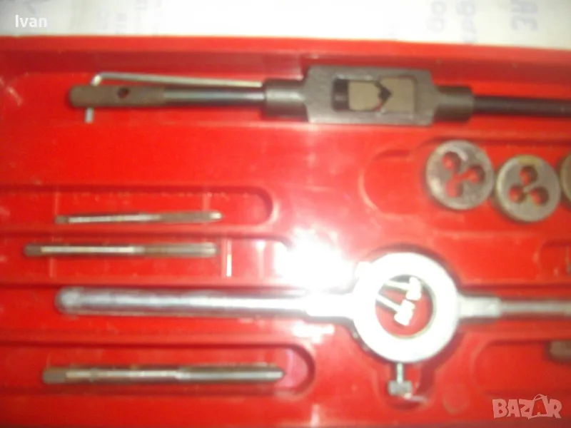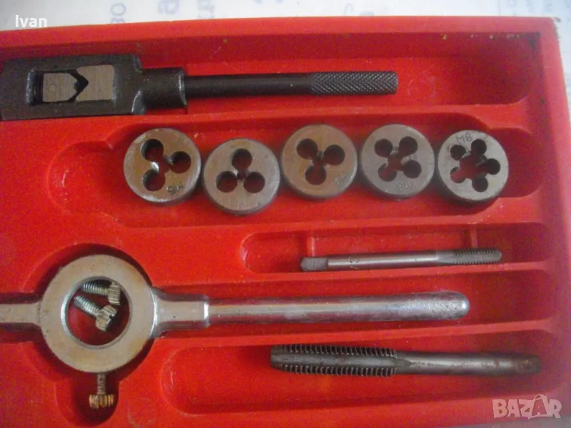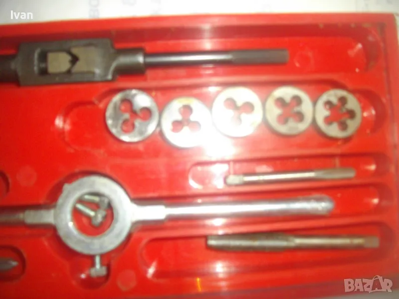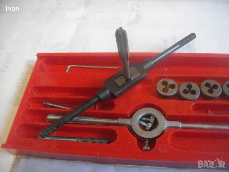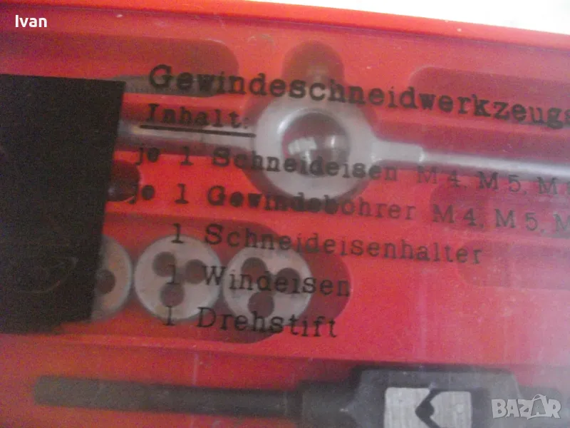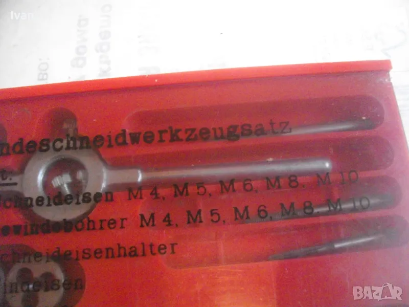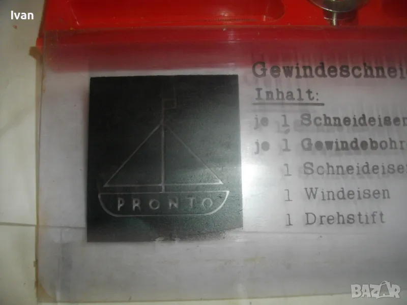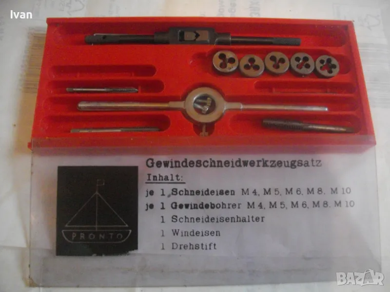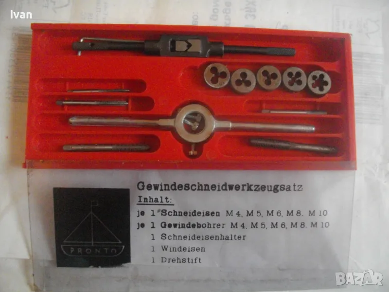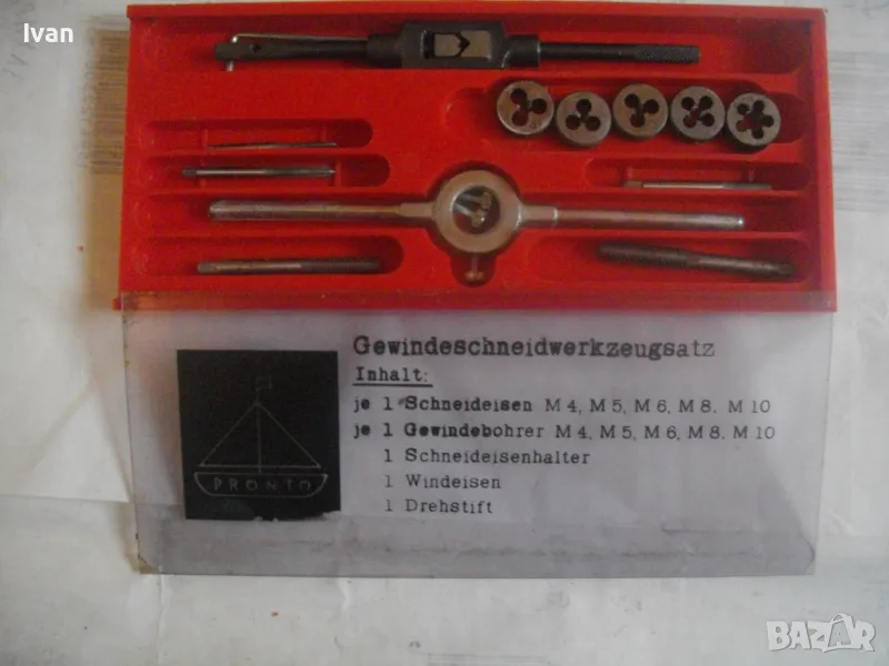 ОПИСАНИЕ на комплект нов резбонарезни плашки и метчици - цена 99 лв. Немски оригинален, съвсев нов, неизползван и неупотребяван. Немски бранд марка PRONTO, с лого голяма платноходка. Кутия пластмасова с размери 245 х 105 х 20 мм, с прозрачен плъзгащ се капак с вписани раазмери и данни за комплекта на немски език. Размери на плашките М4, М5, М6, М8, М10. Размери на метчиците . М4, М5, М6, М8, М10. Държач върток за плашките, държач върток за метчиците. 1 бр. шестостен ключ за пристягане на крепежните болтове към въртока на плашките. Цена на комплекта - 99 лв - твърда, без коментар.
