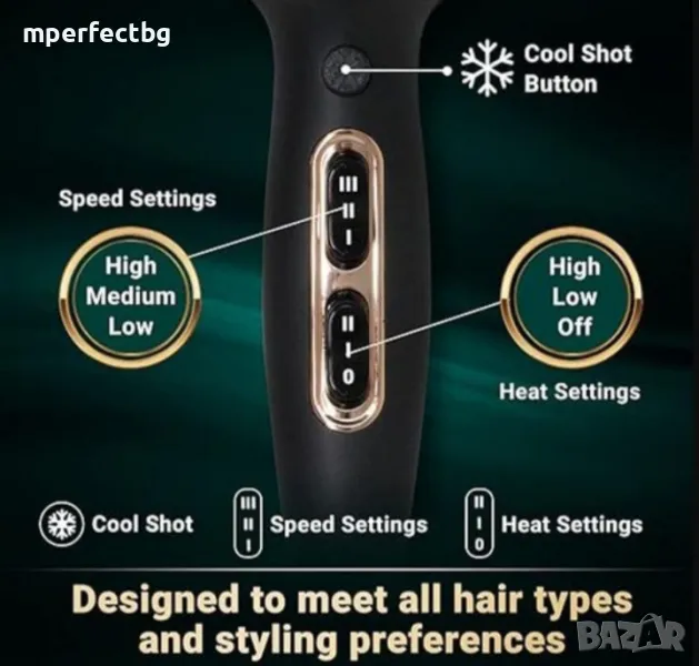 Лек и ергономичен дизайн за лесно боравене, подвижна крайна капачка за лесно почистване. 2-скоростни и 3-нагревателни настройки за гъвкавост на стила.