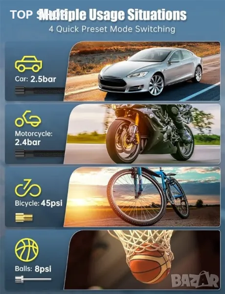 компресор за гуми има голям LCD цифров дисплей с 4 единици за измерване на налягането PSI/KPA/BAR/KG/CM, можете да изберете режима между автомобили/мотоциклети/велосипеди/топки. Той ще отчете точно налягане в гумите в реално време с един поглед и ще ви осигури безопасно използване на базата на функцията за автоматично изключване на желаното ниво. Никога не се притеснявайте от пренапомпване.