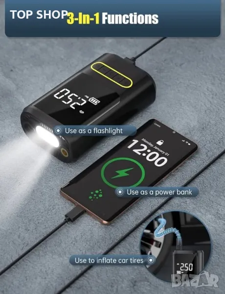 Мултифункционалност: Има 5V/2A USB-C изходен порт, нашият преносим въздушен компресор може да служи като захранваща банка с добър размер. Ултра ярките LED светлини имат 3 режима на светене (дълго ярко/светкавица/SOS), като ви предоставят спешна помощ на тъмно.