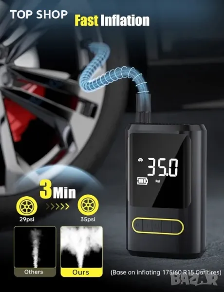 Безжично и 12V DC двойно захранване: Преносимият въздушен компресор има акумулаторна батерия, пълни 4 гуми, когато е напълно зареден. В случай, че батерията се изтощи, въздушната помпа е оборудвана с 9,8 фута 12V DC захранващ кабел, който ви позволява да я захранвате, като я включите в колата. Това гарантира, че никога няма да се притеснявате, че ще останете без захранване в движение.